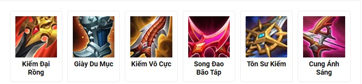 Trang bị: Kiếm Đại Rồng + Giày Du Mục + Vô Cực Kiếm + Song Đao + Tôn Sư Kiếm + Cung Ánh Sáng