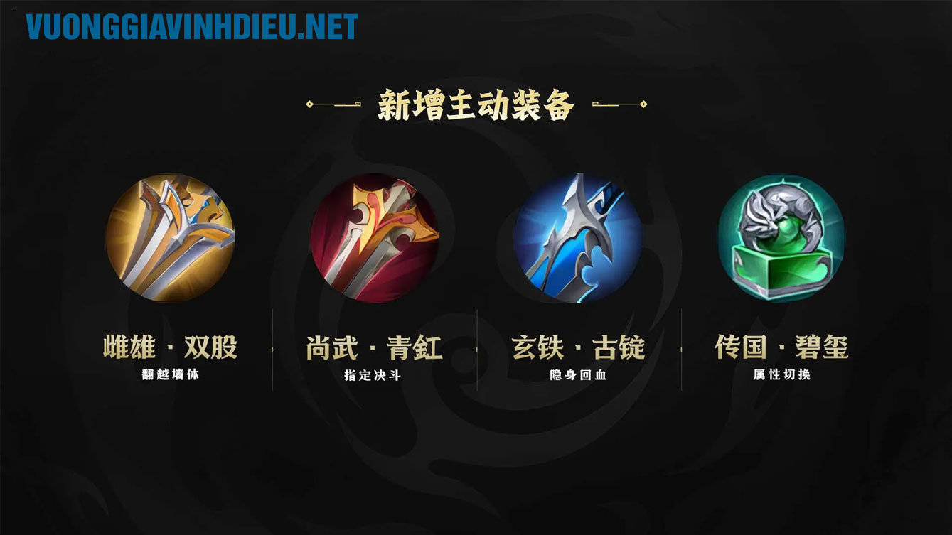 Ngoài ra, còn có một số trang bị sẽ được điều chỉnh, như Huyết Lệ Kiếm sẽ thêm hiệu ứng hút máu từ kỹ năng gây sát thương lên mục tiêu. Gươm Đoạt Mệnh sẽ có thời gian vô địch lâu hơn khi được sử dụng lâu, và Sách Thánh sẽ có một hiệu ứng mới, kích hoạt hồi máu khi máu của tướng dưới 30%. Các hiệu ứng kích hoạt của Đao Sấm Sét, Găng Tay Cuồng Nộ và Gươm Tận Thế cũng sẽ được điều chỉnh. Cụ thể, ba phát bắn sẽ được tính là một đòn tấn công thường và hiệu ứng Gươm Tận Thế sẽ kích hoạt bạo kích toàn bộ. Thêm vào đó, các trang bị chủ động sẽ có thời gian hồi chiêu riêng biệt.