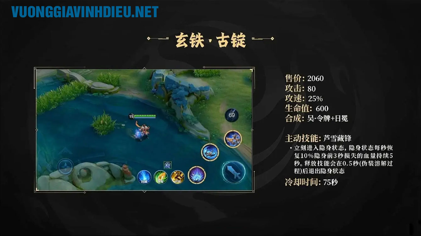 Trang bị thứ ba là kỹ năng ẩn thân, khi sử dụng, người chơi sẽ biến mất khỏi tầm nhìn và hồi phục một phần máu. Hiệu ứng ẩn thân này tương tự như kỹ năng của Quỷ Cốc Tử, giúp tướng có thể lẩn tránh và hồi phục khi cần thiết.