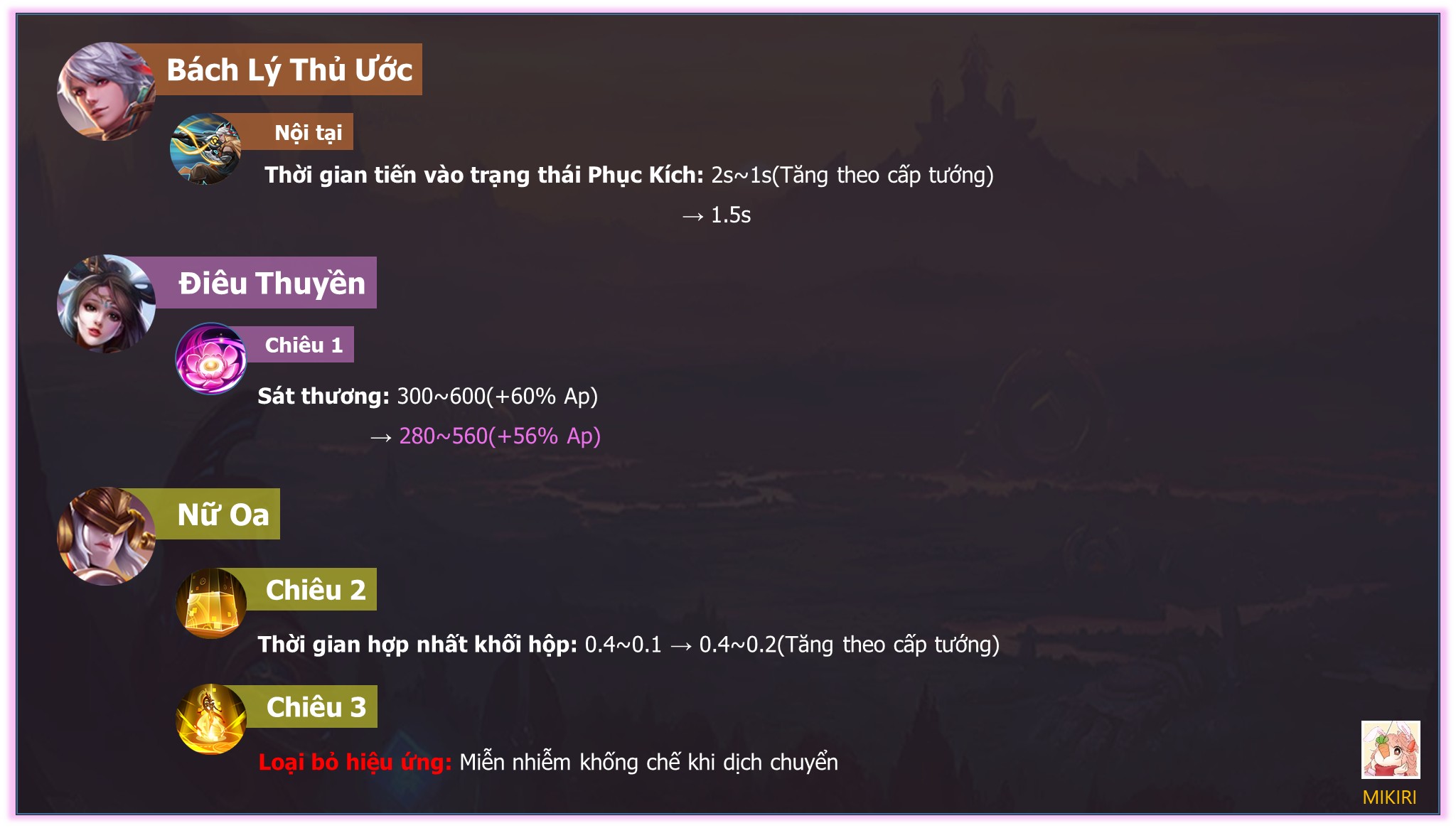 Trong bản cập nhật ngày 5/12 của Vương Giả Vinh Diệu bản nội địa một số tướng đã được điều chỉnh sức mạnh, bao gồm Tư Không Chấn, Bách Lý Thủ Ước, Điêu Thuyền và Nữ Oa.