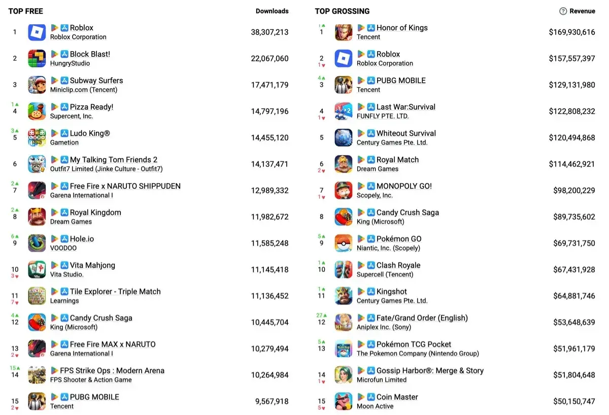 Trong khi đó, Roblox rơi xuống vị trí thứ hai dù vẫn tăng nhẹ doanh thu lên 157,7 triệu USD, duy trì đà ổn định suốt mùa hè.